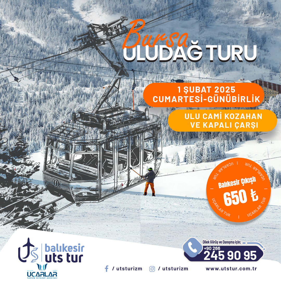 Yol güzergâhında kahvaltı molası sonrası Bursa'nın ve Ülkemizin gözde kış turizm beldesi Uludağ`a hareket ediyoruz. Karla kaplı orman manzaralı yoldan dağa doğru yolculuğumuzun ardından, oteller bölgesi olarak da bilinen Uludağ Meydanı`na ulaşıyoruz. Burada sizleri serbest bırakıyor ve gerek otellerin gerekse de liftlerin imkânlarından faydalanma şansı veriyoruz. Serbest vakitte misafirlerimiz ekstra olarak, kayak yapabilir, telesiyejle zirveye çıkabilir, kar motoruna binebilir, otellerde vakit geçirebilir ya da çevre gezisi yapabilirler. Buluşma saatinde otopark'taki aracımızda sizlerle buluşuyoruz. Bursa ‘ya iniyoruz. Rehber eşliğinde Ulucami , Kapalıçarsı , Kozahan ipekçiler çarşısını geziyoruz buradaki serbest zaman sonrasında dönüş için hareket ediyoruz.