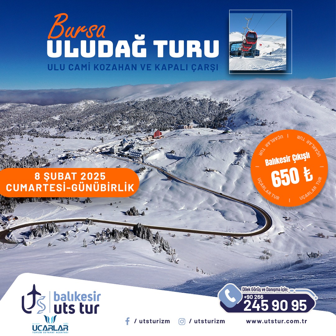 Yol güzergâhında kahvaltı molası sonrası Bursa'nın ve Ülkemizin gözde kış turizm beldesi Uludağ`a hareket ediyoruz. Karla kaplı orman manzaralı yoldan dağa doğru yolculuğumuzun ardından, oteller bölgesi olarak da bilinen Uludağ Meydanı`na ulaşıyoruz. Burada sizleri serbest bırakıyor ve gerek otellerin gerekse de liftlerin imkânlarından faydalanma şansı veriyoruz. Serbest vakitte misafirlerimiz ekstra olarak, kayak yapabilir, telesiyejle zirveye çıkabilir, kar motoruna binebilir, otellerde vakit geçirebilir ya da çevre gezisi yapabilirler. Buluşma saatinde otopark'taki aracımızda sizlerle buluşuyoruz. Bursa ‘ya iniyoruz. Rehber eşliğinde Ulucami , Kapalıçarsı , Kozahan ipekçiler çarşısını geziyoruz buradaki serbest zaman sonrasında dönüş için hareket ediyoruz.
